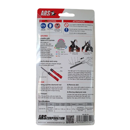 El afilador de diamante triangular ARS SD-95-PN ha sido diseñado para proporcionar un afilado preciso y seguro en las herramientas ARS, adaptándose de forma especial a las hojas curvas. Gracias a su diseño triangular, este afilador protege la cuchilla mientras realza su filo, prolongando la vida útil del instrumento.